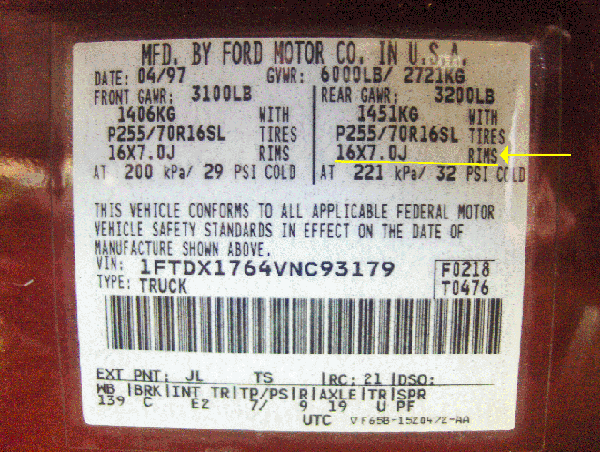 | This sticker was located in the drivers door jamb of my Ford F-150. I used this to help me with my larger rim selection. Since my OE width was 7.0in. I used a rule of 2.0in. over stock, so 9.0in. wide is my max. This helped me determine how large a diameter wheel I could upgrade to 24's or 26's, any larger and the width would increase to 10in. and would not turn correctly. I chose 24's because back in 2004 26's were a $10,000+ wheel/tire package. |